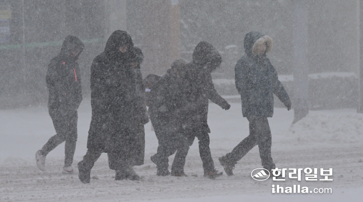 | 많은 눈이 내린 23일 오전 제주시 아라동에서 시민들이 얼어붙은 도로 위를 조심히 걷고 있다. 이상국기자 |