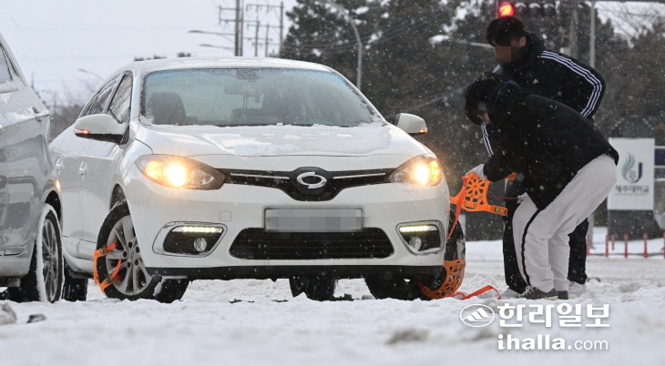 | 23일 제주대학교 사거리 인근에서 한 운전자가 차량을 멈추고 바퀴에 체인을 감고 있다. 이상국기자 |