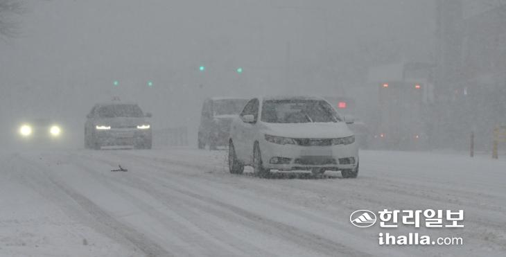 23일 오전 많은 눈이 내리면서 제주시내를 운행 중인 챠량들이 거북이걸음을 하고 있다. 이상국기자