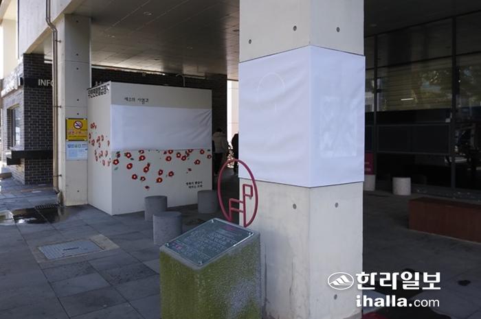 서귀포시청 동측 '제주4·3과 오월 걸상' 아트월과 기둥 낙서를 가리기 위해 서귀포시에서 하얀 천을 덮어 놓았다. 진선희기자