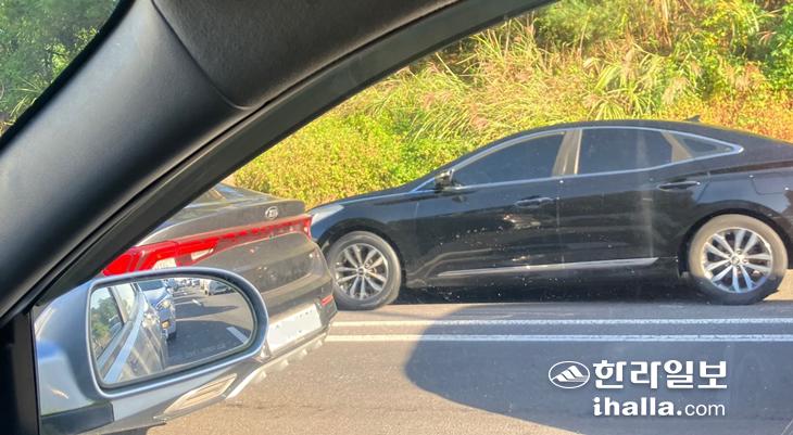 제주시 애조로에서 교통 체증을 피해 갓길로 주행하고 있는 차량.