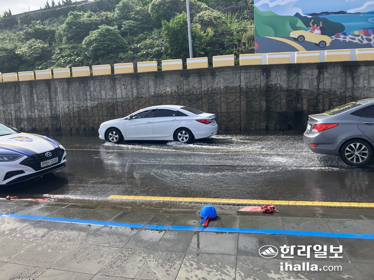 | 투쟁위의 방류수 관련 퍼포먼스로 인해 도로에 물 웅덩이가 크게 고여 지나가는 차량들이 서행하고 있다. |