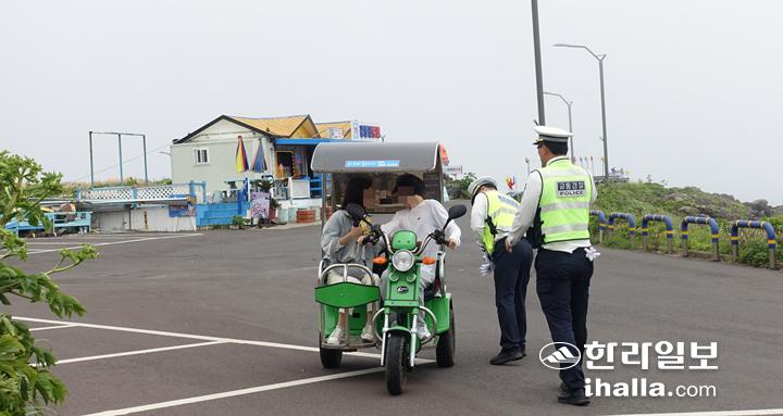 제주동부경찰서는 20일 오전 제주시 우도면 일대에서 교통법규 및 기초질서 위반 행위에 대한 기획 단속을 실시했다. 단속 대상은 무단횡단, 쓰레기 무단투기부터 음주·무면허 운전, 이륜차 및 전기자전거 안전모 미착용까지 다양했다.