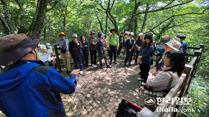 고태용 자연환경해설사가 물찻오름 전망대에서 하늘빛과 신록의 나뭇잎을 그대로 투영한 물찻오름의 신비로운 물빛에 대한 이야기를 들려주고 있다. 백금탁기자