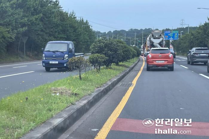 [한라일보] 17일 제주시 애월읍과 조천읍을 연결하는 애조로 중앙분리대 화단 위. 초여름 예초작업이 이뤄진 화단에는 잘린 풀들이 군데군데 쌓여 있다.