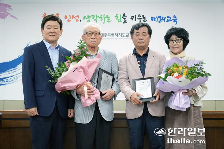 제주특별자치도교육청은 지난 12일 도교육청 상황실에서 고 강성홍 선생과 고 양종찬 선생에게 교육감 감사패를 수여했다.