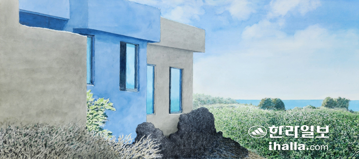 8월의 뙤약볕은 그늘에서 그려야 더욱 뚜렷하다. 동쪽으로 향해 있는 유리창에 희미하게 반사된 수평선과 과수원은 놀라운 확률적 발견이다. 어찌 생각하면 중산간 마을이라고 할 수 있는 이곳에서 수평선을, 그것도 감귤밭과 함께 그릴 수 있다는 경이로움으로 강렬한 태양광선과 반사광선의 상호관계를 치밀하게 그려나갔다. 상대과원이라고 하는 옛 역사성이 유리창에 반사되고 있음을 상징하고 싶었다. 거기에다가 '아침을 여는 사람들'의 마음가짐을 동쪽 창문에 투영시키고 싶었고. 집과 과수원 사이 돌담은 그늘 속에서 더욱 짙은 무게감을 보여준다. 초가였던 시절부터 있었으리라는 이 마을 고참님이시라는 생각에 숙연해진다. 여름날 해양성 뭉게구름이 하늘을 수놓아 더욱 풍요롭다. 어떤 경이로운 풍경은 처음엔 놀라움을 주겠지만 세월이 지날수록 식상해지는 것. 하지만 너무도 평범한 이 마을의 집과 밭, 멀리 수평선의 조화는 실증과의 전쟁에서 항상 승리를 거둔다. 이유는 분명하다. 삶의 터전이 있는 그대로의 진솔함이니까.