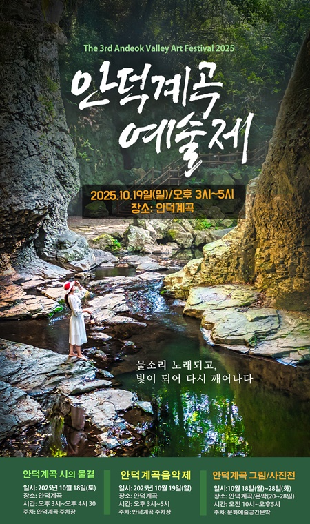 예술제 첫날인 18일 오후 3시부터는 안덕계곡을 주제로 한 공모전의 시 우수작을 낭송가들이 읊는 '안덕계곡 시의 물결' 행사가 열린다. 시 낭송과 함께 지역 예술인들의 버스킹도 진행된다. 또 몬딱 그림·사진 동아리와 서풍애 동아리 회원들이 참여하는 '안덕계곡 그림·사진전'도 함께 열린다. 그림·사진전은 이달 28일까지 이어진다.