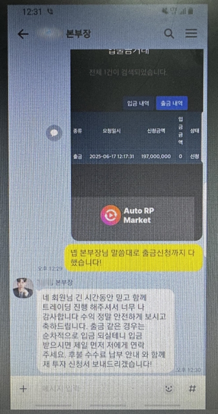 투자리딩 사기 조직이 피해자와 나눈 채팅. |