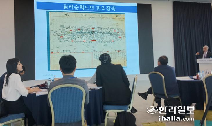 23일 오전 제주대박물관에서 '2025년 해양실크로드 국제학술대회' 기조 강연이 진행되고 있다. 진선희기자