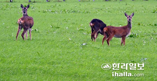 [한라일보] 23일 제주시 조천읍 교래리 한 목장에 노루 가족이 찾아와 한가롭게 풀을 뜯어 먹고 있다. 강희만기자