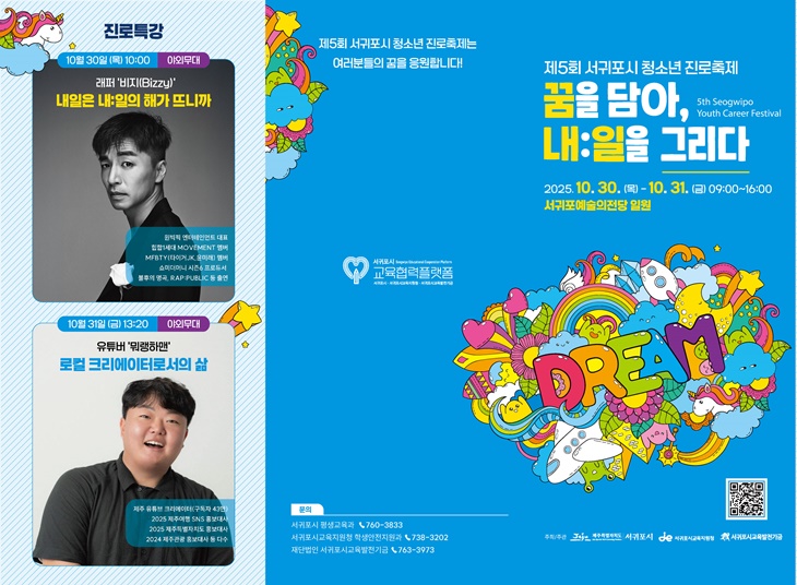 서귀포시와 서귀포시교육지원청, (재)서귀포시교육발전기금은 이달 30일부터 31일까지 이틀간 오전 9시부터 오후 4시까지 서귀포예술의전당 일원에서 2025 서귀포시 청소년 진로축제 '꿈을 담아, 내:일을 그리다'를 연다고 27일 밝혔다.
