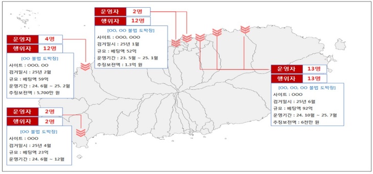 이밖에 제주시 내에서 도박장 개설 및 명품을 담보로 도박자금을 빌려주거나, 서귀포지역에서 빌라를 개조해 불법 도박장을 개장·운영한 사례도 있다.