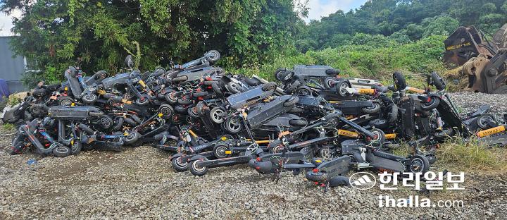 [한라일보] 제주시에 위치한 한 임야에서 전동 킥보드 100여 대와 건설 폐기물 등이 방치돼 시민들의 눈살을 찌푸리게 하고 있다.
