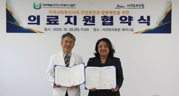 이윤복 서귀포의료원장은 "이번 협약이 지역 복지현장의 지속 가능한 건강관리 기반을 마련하는 첫걸음이 될 것"이라며 "건강한 복지현장이 곧 건강한 지역사회라고 생각해 보다 건강하게 현장에서 활동할 수 있도록 의료적 지원을 지속적으로 확대해 나가겠다"고 밝혔다.