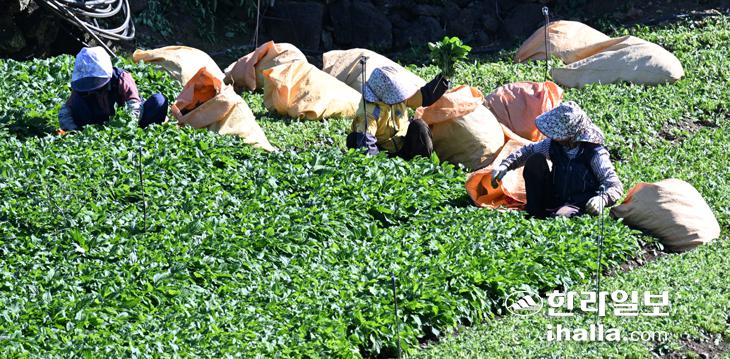 [한라일보] 30일 제주시 애월읍 농경지에서 농민들이 취나물 수확 작업을 하고 있다. 강희만기자