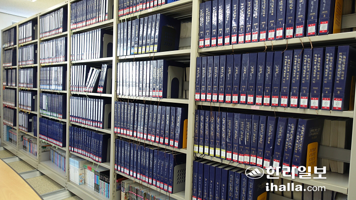 | 제주점자도서관의 책장. 다양한 점자도서들이 서가에 꽂혀 있다. |