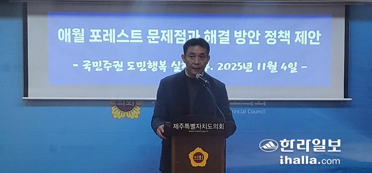 [한라일보] 더불어민주당 제주 당원 모임인 국민주권 도민행복 실천본부는 4일 제주도의회 도민 카페에서 기자회견을 열고 최근 특혜 논란이 이어지고 있는 애월포레스트 사업에 대해 "제주도정은 사업의 전략환경영향평가를 무효화하고, 행정사무감사를 통해 진실을 규명하고 필요한 시정을 요구해야 한다"고 촉구했다.