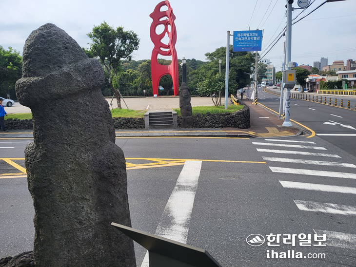 | 제주도민속자연사박물관 돌하르방. 제주도 민속문화유산으로 지정된 박물관 입구 2기의 돌하르방 너머로 한명섭 작가의 대형 돌하르방 조형물이 서 있다. 진선희기자 |