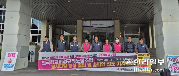 제주학교비정규직연대회의는 이날 도교육청 앞에서 기자회견을 열고 "교육감의 결단을 촉구한다"면서 "이 절박한 목소리를 외면한다면, 우리는 11월과 12월 전국 총파업으로 교육 현장을 멈춰 세울 것"이라고 밝혔다.