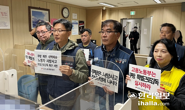 노조는 기자회견을 마치고 광주지방고용노동청 제주근로개선지도센터에 ‘쿠팡 제주 새벽배송 노동자 사망사고 특별근로감독 촉구 서한’을 제출했다.