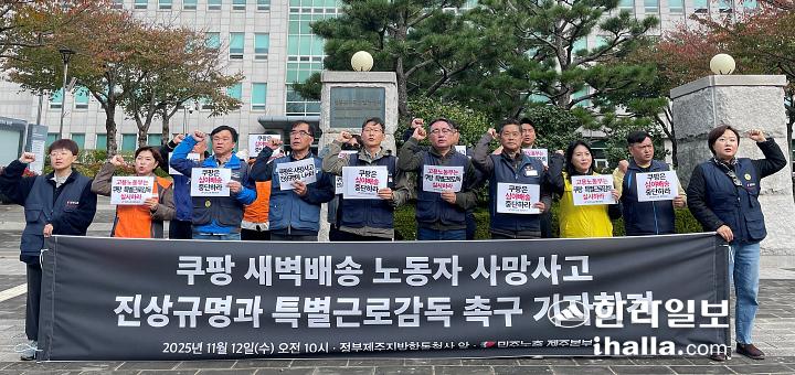 민주노총 제주본부(이하 노조)는 12일 오전 정부제주지방합동청사 앞에서 기자회견을 열고 “쿠팡은 심야배송을 중단하고 사망사고 진상을 밝혀라”고 요구했다.