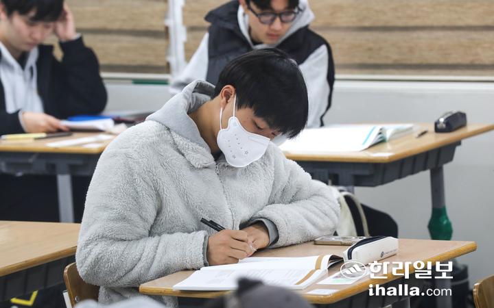 [한라일보] 2026학년도 대학수학능력시험일인 13일 오전 제주특별자치도교육청 95지구 제2시험장이 마련된 제주제일고등학교에서 수험생들이 막바지 시험 준비를 하고 있다.