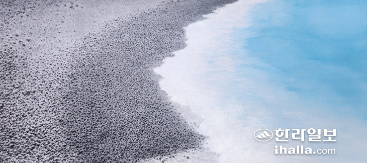 마을에 깃발을 만들려면 이 네 개의 색이 필요하다. 옅은 회색, 짙은 회색, 하얀색, 그리고 바다에 비친 하늘색. 보기에는 단순 명료하지만 알작지의 몽돌들을 그린다는 것은 한 땀 한 땀 바느질 하는 것과 같다. 좁쌀만큼한 크기에도 명암이 있으니 정밀묘사와 차원이 다른 고행(?)이다. 파도가 밀려왔다 밀려가는 그 사이에 젖은 자갈들이 동양화적 파묵의 매력을 발생시킨다. 부서지는 저 하얀 파도가 더욱 하얗게 눈부신 것은 짙은 회색과 만사 명도대비가 극대화되기 때문. 파도의 포말 범위가 다른 바닷가 보다 그 폭이 더 넓은 것은 바닷물 밑에도 몽돌들이 숨어 있기 때문이다. 보이지 않는 밑에서도 파도를 찢어줘서 그럴 것이다. 육지와 바다가 만나는 방식은 이토록 식상하지만 언제나 경이로움으로 와닿게 되는 것은 똑같은 형태의 선을 그리는 경우가 없기 때문이다. 저 카오스적 확률이 보여주는 변화의 동작. 알작지에서 느끼게 되는 자연의 신비를 너무도 단순한 대비효과를 통해 얻게 됐다.