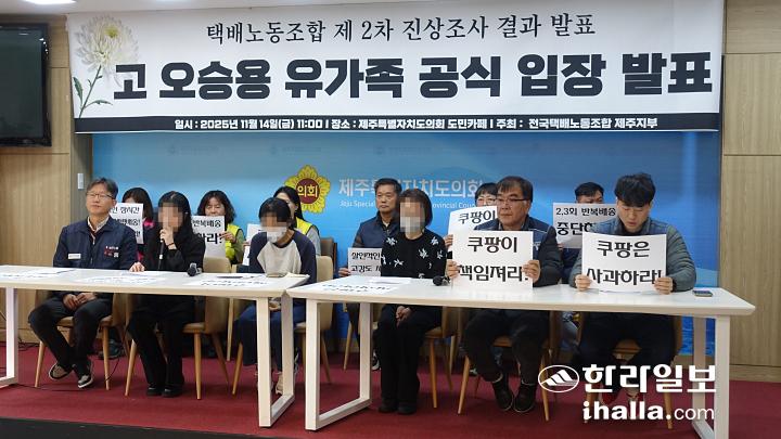 사고로 숨진 쿠팡 배송기사 고(故) 오승용씨의 유가족과 전국택배노동조합 제주지부는 14일 오전 제주도의회 도민카페에서 유가족 공식 입장 및 제2차 진상조사 결과 발표 기자회견을 가졌다.