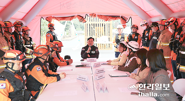 제주동부소방서(서장 강성부)는 지난 17일 서귀포시 남원읍 서귀포농업기술센터에서 다중운집행사 중 다수사상자 발생 상황을 가정해 긴급구조통제단 불시 가동 훈련을 실시했다.