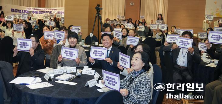 24일 열린 2025 수눌음돌봄공동체 성과 공유회에서 오영훈 지사 등 참석자들이 손팻말을 들고 기념사진을 찍고 있다. 제주도 제공