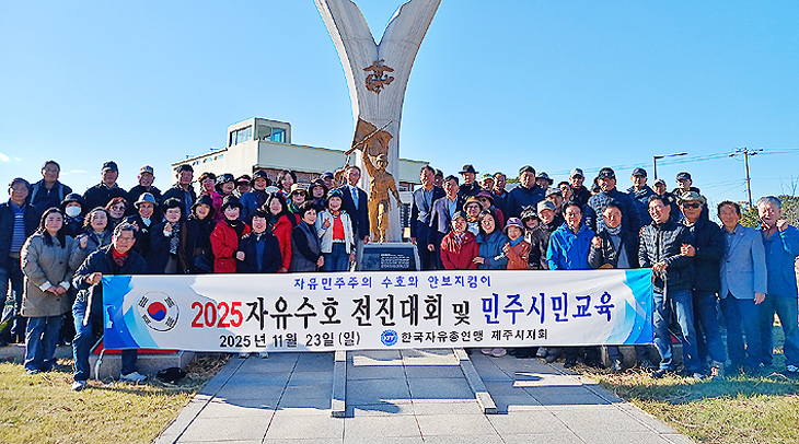 한국자유총연맹 제주시지회는 지난 23일 대정읍 소재 해병대 3·4기 호국관에서 '2025 자유수호 전진대회'를 개최했다.