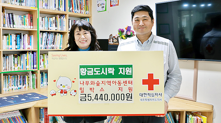 대한적십자사제주특별자치도지사(회장 정태근)는 26일 나무와숲지역아동센터(센터장 송미경)에 '건강한 성장을 위한 밀박스(황금도시락) 지원 사업' 급간식비 544만원을 지원했다.