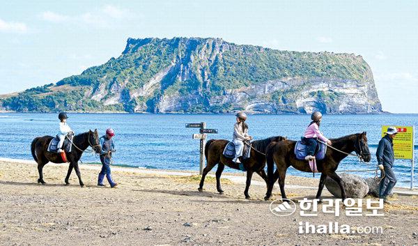 [한라일보] 26일 서귀포시 성산읍 광치기해변에서 가족단위 관광객들이 승마체험을 하고 있다. 강희만기자