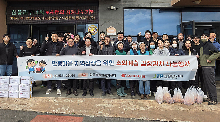 제주테크노파크(원장 지영흔)는 지난 26일 제주시 구좌읍 한동리 종합복지회관에서 한동리 부녀회와 함께 '사랑의 김장김치 나눔 행사'를 열었다.