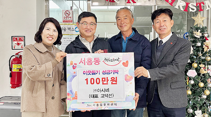 서귀포시 소재 (주)아시네(대표 고덕선)는 지난달 27일 서홍동주민센터를 방문해 이웃돕기 성금 100만원을 기탁했다. 성금은 서귀포종합사회복지관을 통해 지역 내 취약계층을 위해 사용될 예정이다.