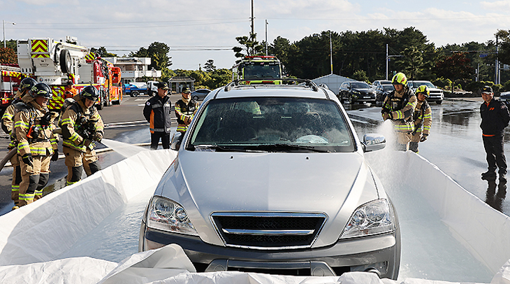 이날 ▷이동식 수조 활용 전기차 배터리 냉각·침수 진압장비 운용 숙달 훈련 ▷차량용 이동기 이용 화재 차량 옥외 이동·배치 등 현장 실증 중심의 반복·숙달 훈련을 병행했다.
