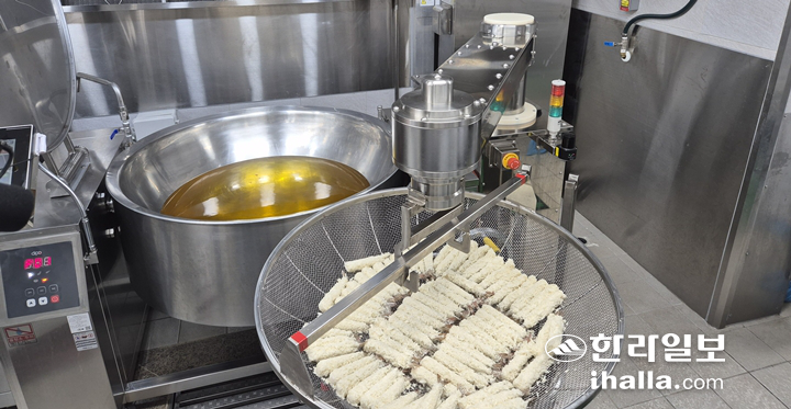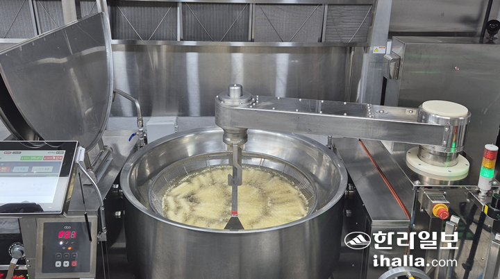 금속 재질의 조리로봇이 곧바로 회전을 시작하더니 튀김망을 집어 들고 끓는 기름 솥 중앙으로 이동했다. 일정 시간이 지나자 로봇 팔은 정확한 각도로 튀김망을 들어 올렸고, 주변 조리종사자들은 "로봇이 알아서 해주니 훨씬 수월하다"는 반응을 보였다. 제주특별자치도교육청이 이날 선보인 '인공지능(AI) 기반 제주형 학교급식 조리로봇' 첫 공식 시연 현장이다.