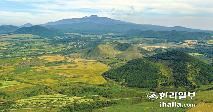 | 새별오름, 정면 가운데 풀밭으로 이루어진 오름, 오른쪽 아래는 이달오름. 사진 난대아열대산림연구소 김진 제공 |