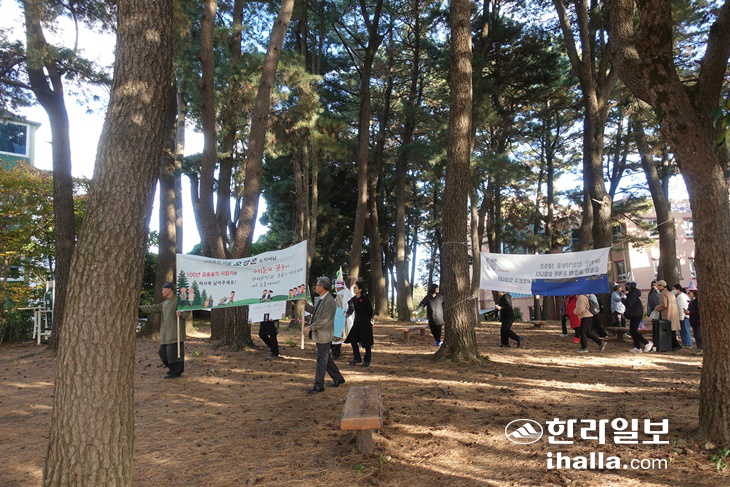 | 5일 오후 시민들이 '서귀포의 아들 오영훈 도지사님, 100년 곰솔숲의 지킴이로 역사에 남아주세요'란 문구가 적힌 현수막을 들고 서귀포학생문화원 소나무 숲과 그 주변을 행진하고 있다. |