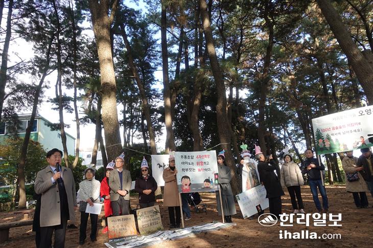 | 5일 오후 오영훈 지사의 현장 방문 전 서귀포학생문화원 잔디광장과 소나무 숲을 관통하는 도로 개설에 반대하는 시민들이 발언하고 있다. |