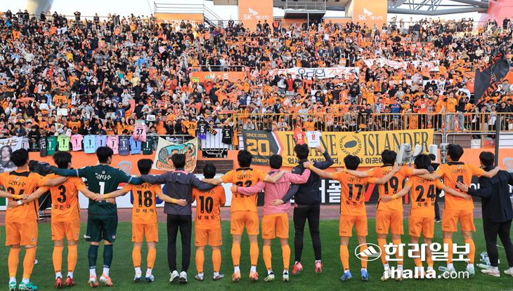 7일 서귀포시 제주월드컵경기장에서 하나은행 K리그 승강 PO 2차전 제주SK와 수원삼성의 경기. 선수들과 팬들이 환호하고 있다. 연합뉴스