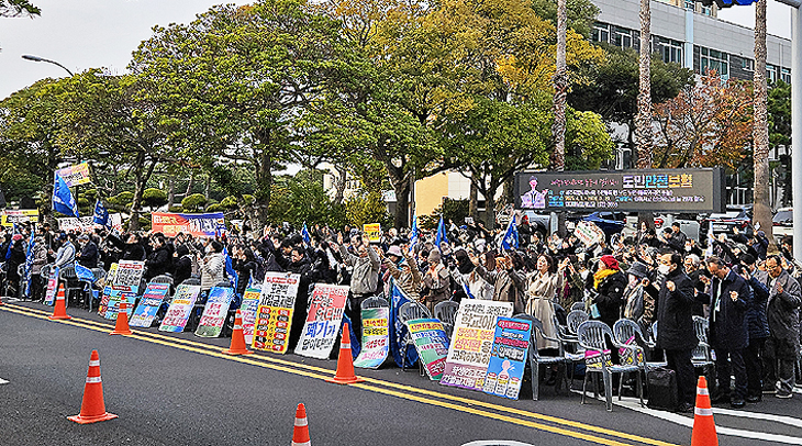 제주거룩한방파제 단체 관계자는 "'제주평화인권헌장' 안에 들어 있는 차별금지법 독소조항(성적지향·성별정체성을 차별금지 대상으로 포함)이 제정돼서는 안 된다"며 "반대하는 사람들이 많이 있고 끝까지 반대한다는 것을 알리겠다"고 말했다.