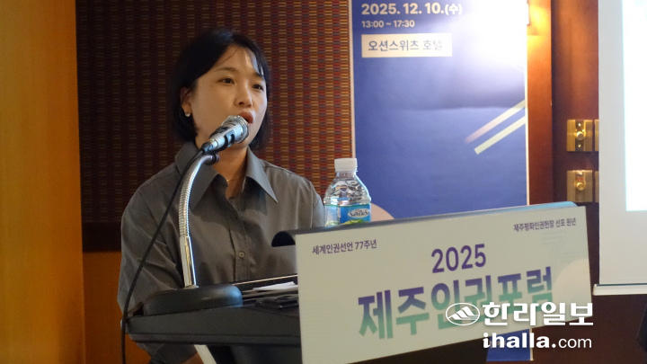 | 10일 열린 2025 제주인권포럼 ‘환경’ 세션에서 강윤희 제주환경운동연합 생활환경국장이 발제하고 있다. 양유리기자 |