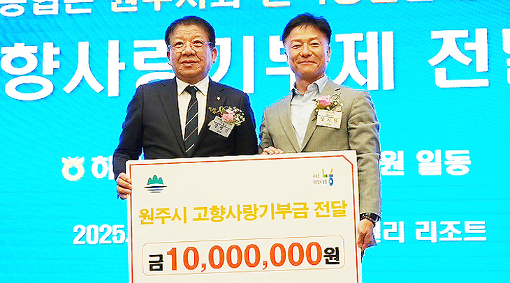 하귀농협(조합장 강병진)은 지난 9일 강원도 원주시에 고향사랑기부금 1000만원을 전달했다.