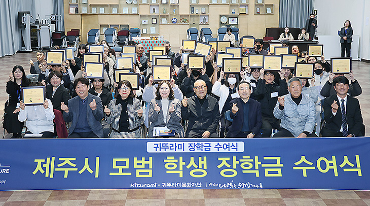 제주시와 귀뚜라미그룹(회장 최진민)은 10일 '2025년 제주시 장학생 장학금 및 장학증서 수여식'을 열어 지역 우수 학생 50여 명에게 장학금을 전달했다.