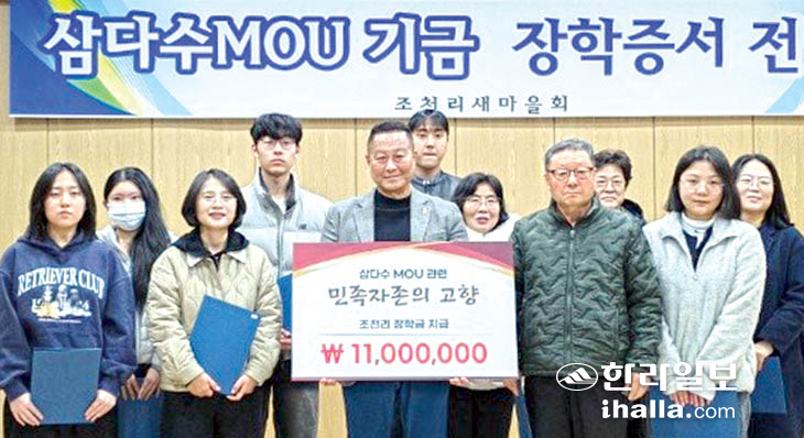 제주시 조천리새마을회(이장 박재영)는 제주 삼다수 업무협약(MOU)로 마련된 장학금을 지역 내 고등학교 졸업예정자와 대학생 11명에게 각 100만원씩 전달했다.
