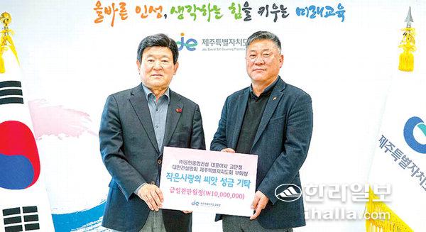 [한라일보] (주)동인종합건설(대표 고만철)과 (주)세현건설(대표 김형구)은 18일 제주특별자치도교육청에 '작은 사랑의 씨앗' 성금 2000만원을 기탁했다.