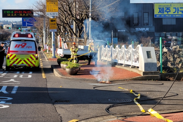 19일 제주소방안전본부에 따르면 이날 오전 9시 18분쯤 제주시 노형동의 한 도로에서 2만2900v 고압전선이 절단돼 불이 났다는 신고가 접수됐다.
