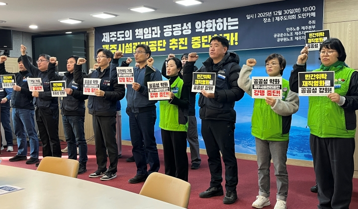 그러면서 “제주도는 지자체의 책임성과 공공성을 약화하고 위험의 외주화와 저임금 계약직 양산으로 노동권을 후퇴시킬 시설관리공단 추진을 중단해야 한다”며 “도의회는 공공서비스의 질을 떨어뜨리고 도민의 부담을 가중할 시설관리공단 조례안 입법에 반대하라”고 요구했다.